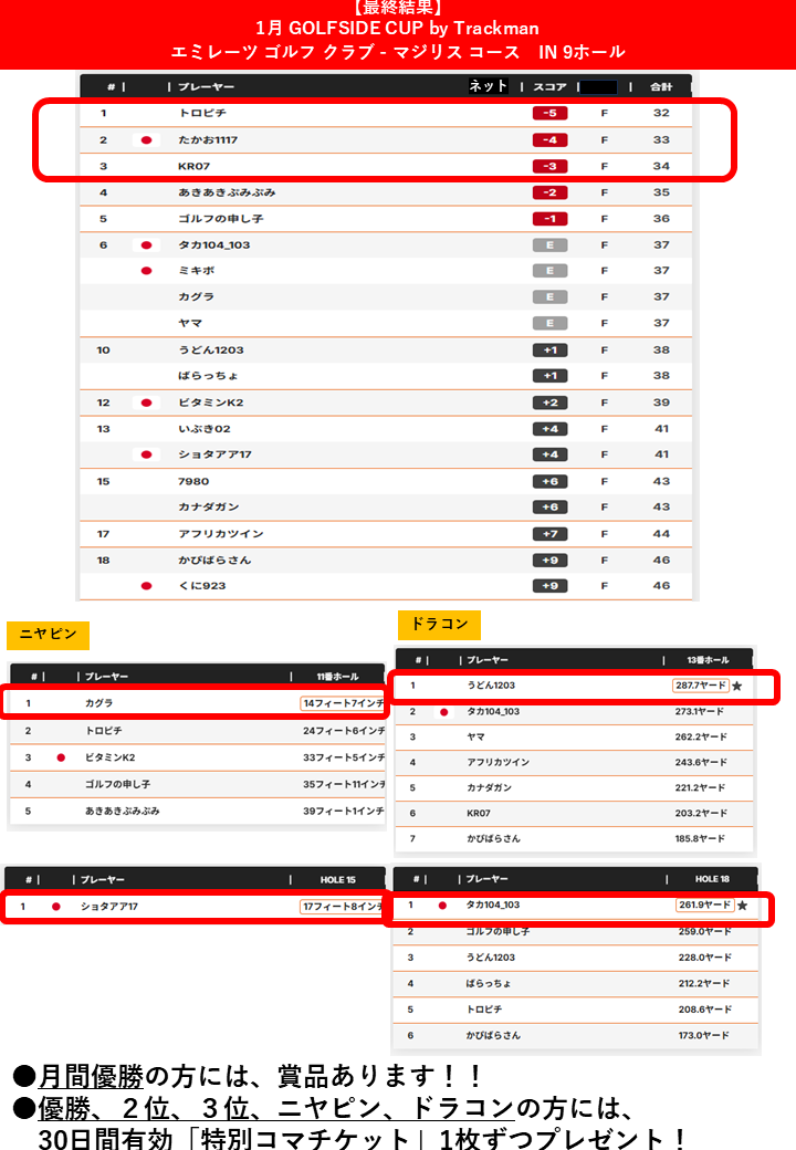 上位3位までまたはニヤピン、ドラコンに該当される方には